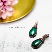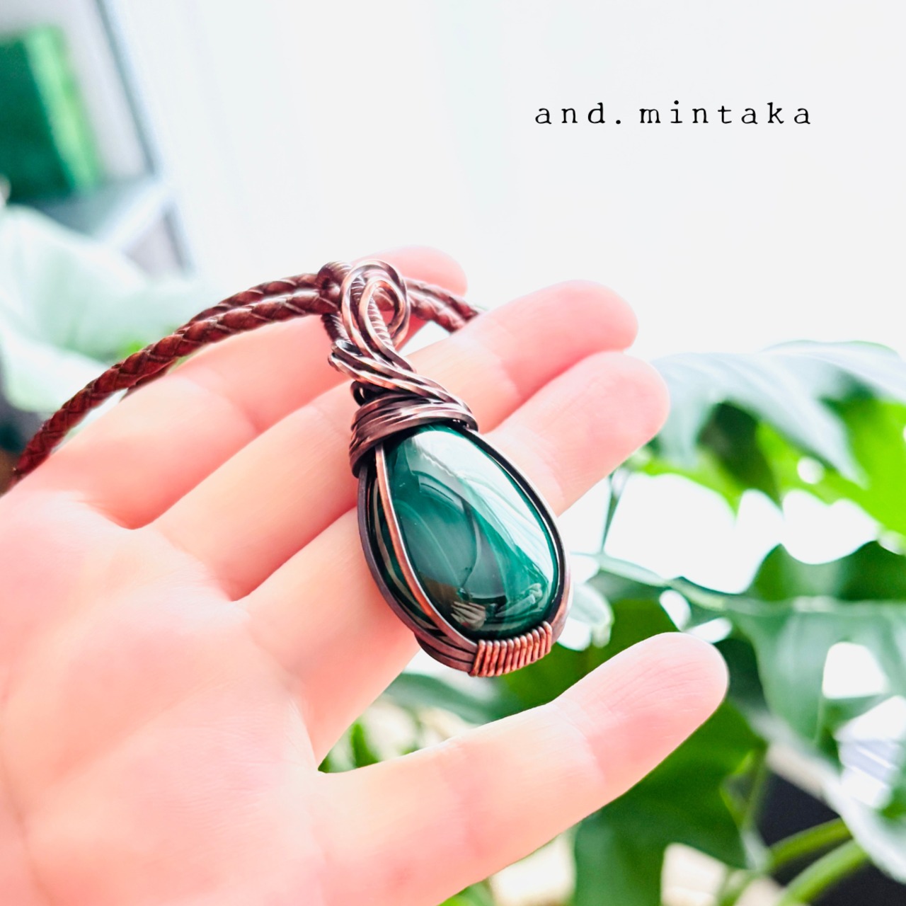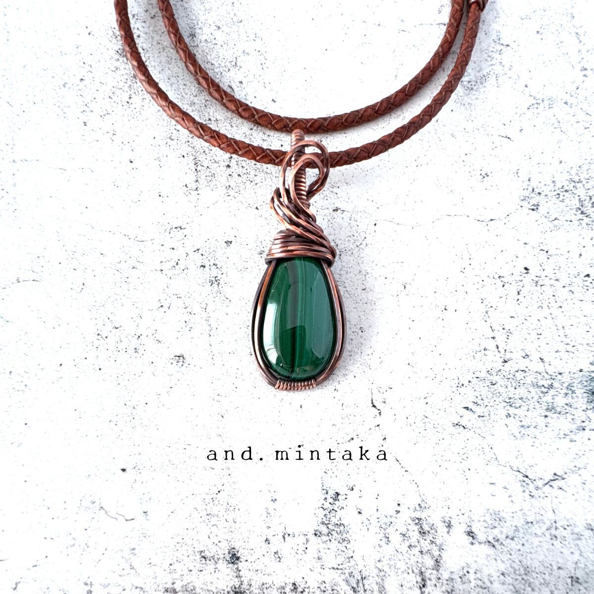 葉に宿る緑の雫 心に寄り添う天然石マラカイトペンダント②|コッパーワイヤーラッピング|革紐付|一点物|送料無料