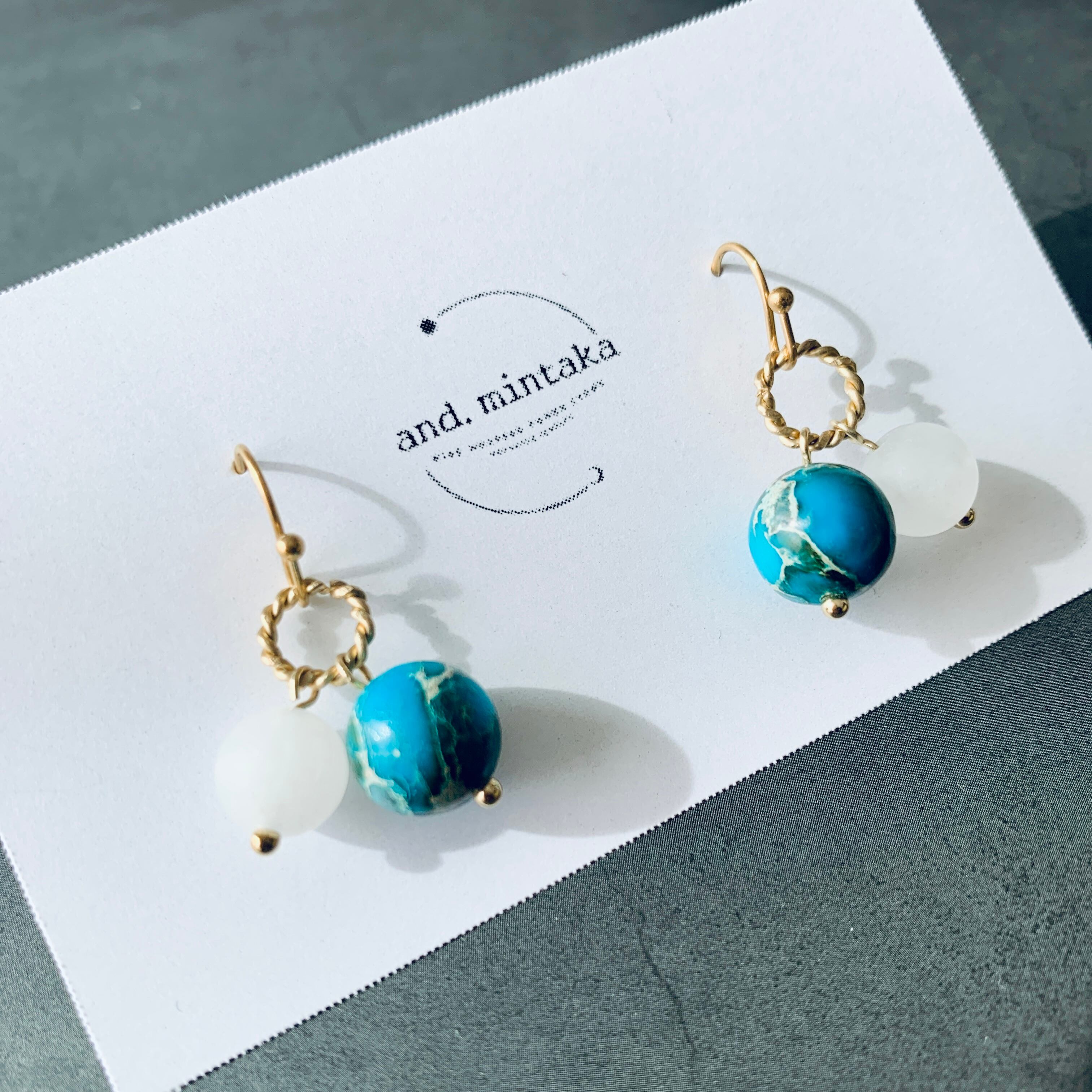 本作品は手作りの真鍮ワイヤーで作ったツイストリングに天然石のアースカラーのターコイズ&アイスのようなホワイトジェイドが上品に揺れるピアスです。