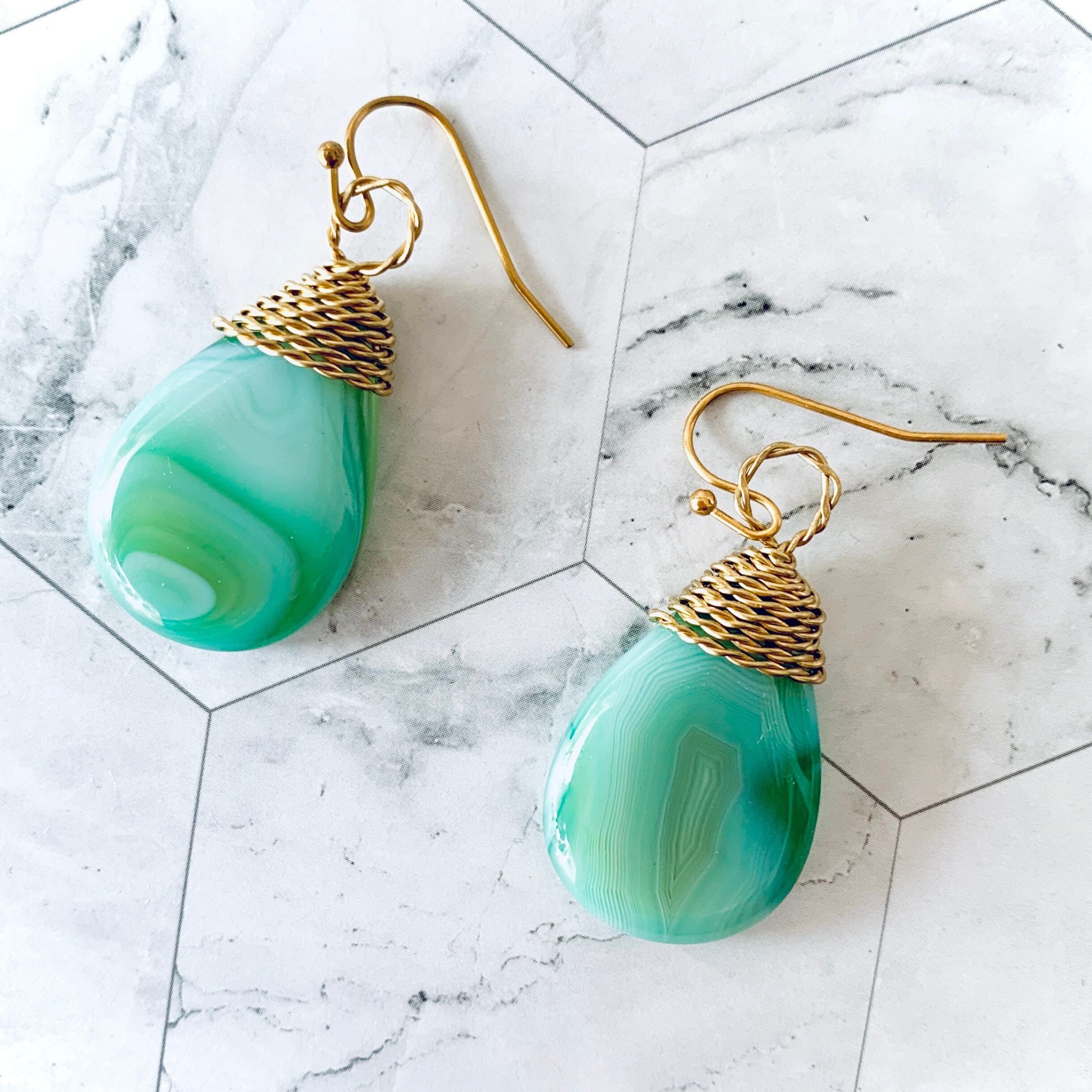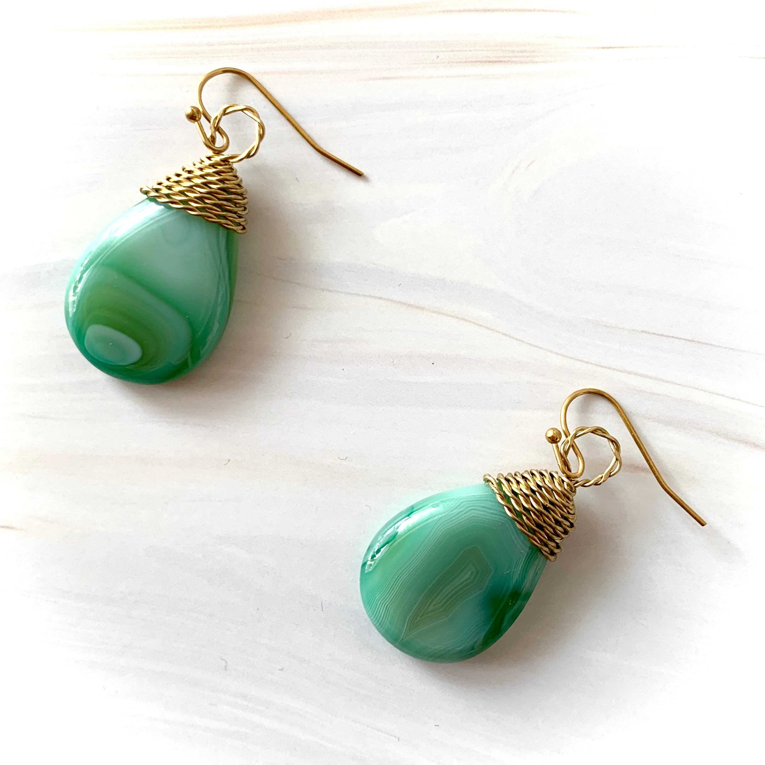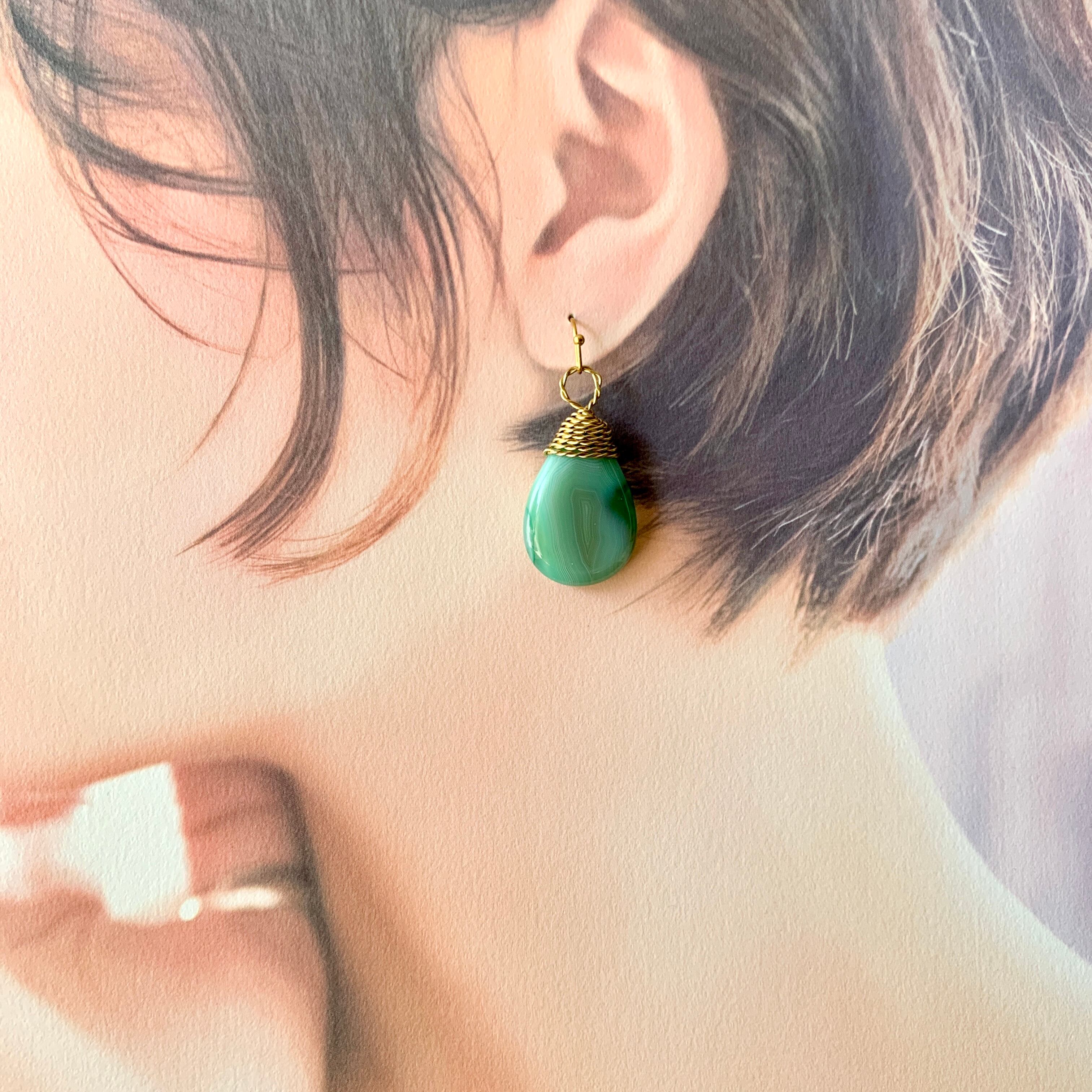 本作品は抹茶ラテのようなマーブルカラーが可愛い天然石のアゲードを真鍮ワイヤーでラッピングした一点物のフックピアス。