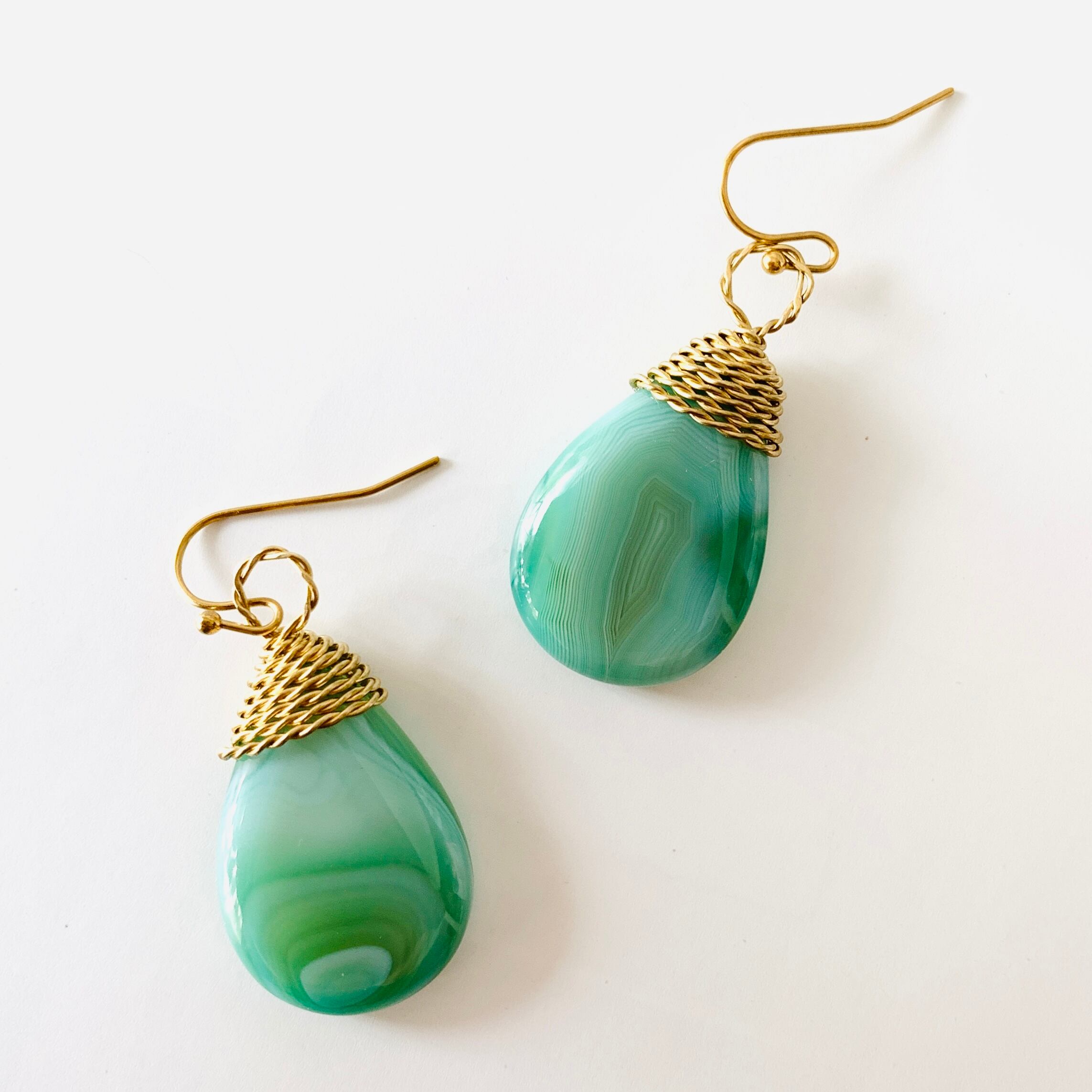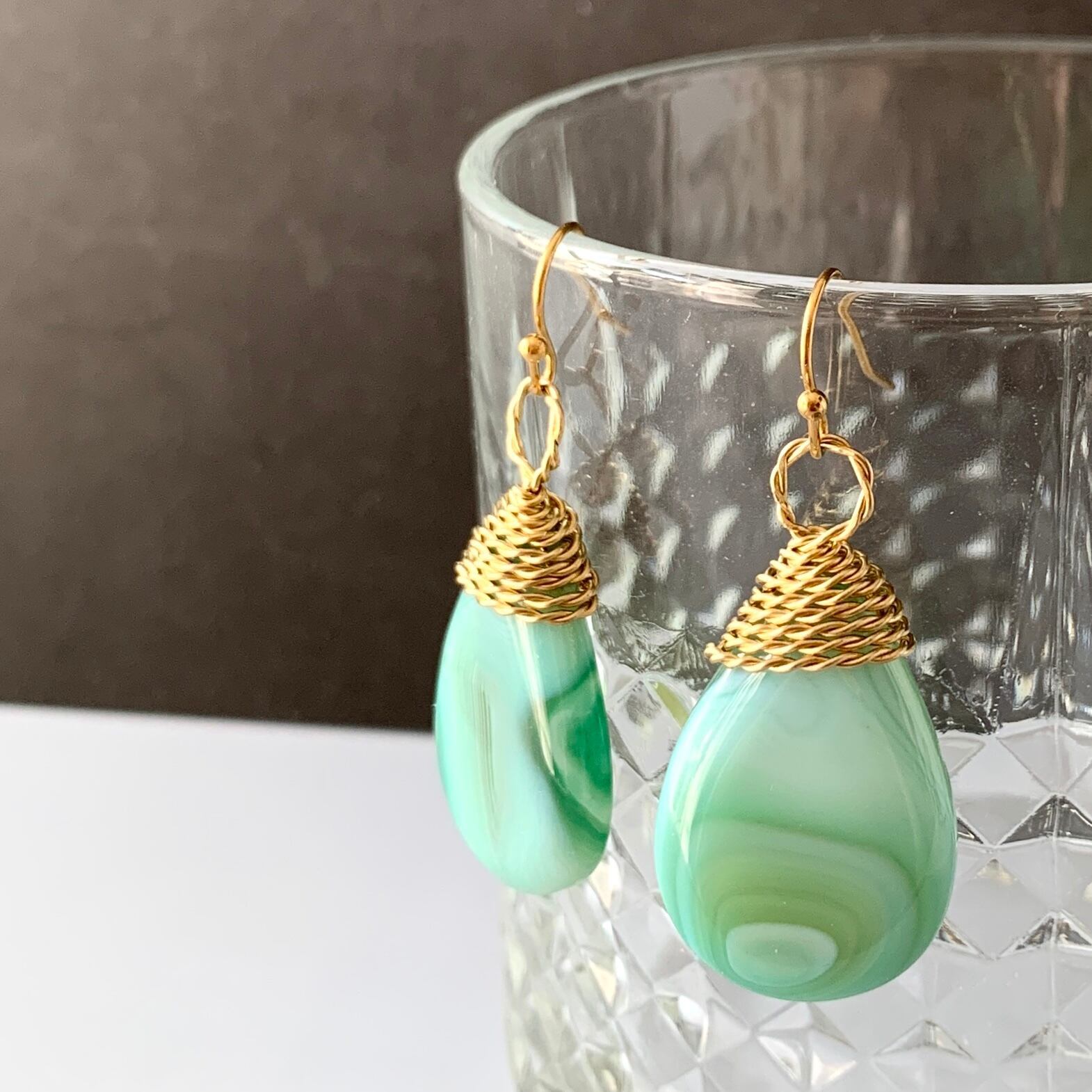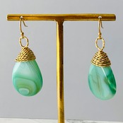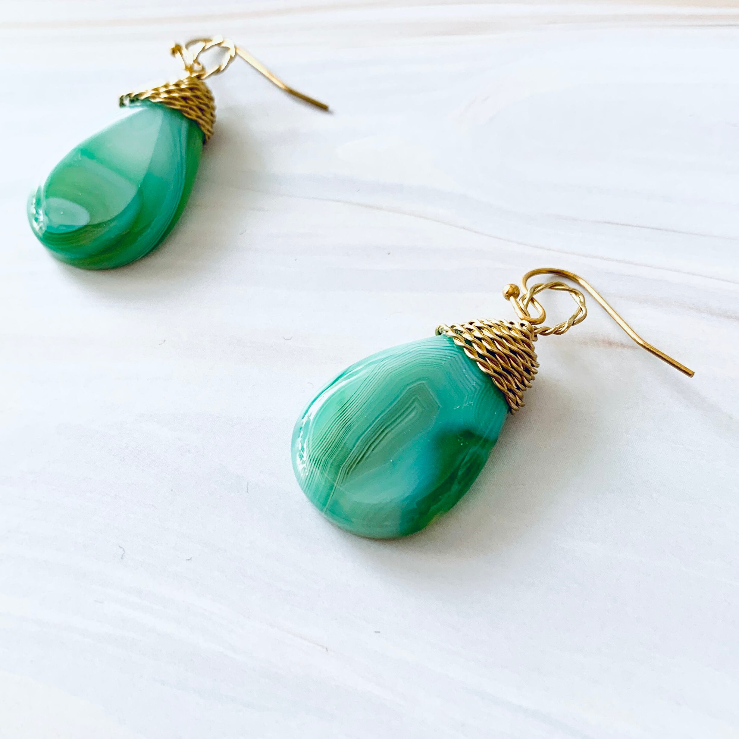 本作品は抹茶ラテのようなマーブルカラーが可愛い天然石のアゲードを真鍮ワイヤーでラッピングした一点物のフックピアス。