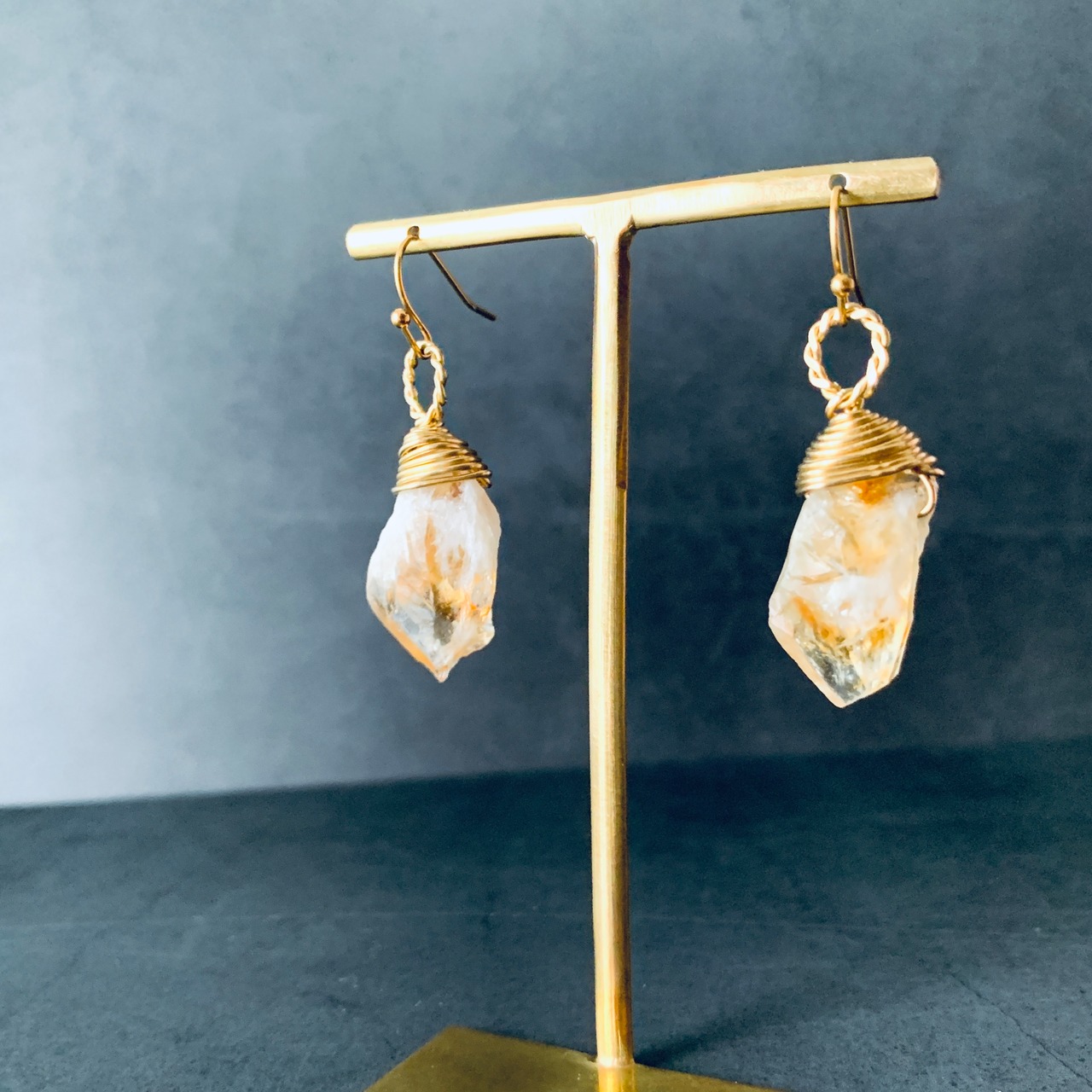 11月誕生石のシトリンを真鍮ワイヤーでラッピングで仕上げた大ぶりですがシンプルで上品なデザインのフックピアス。シトリンの自然な輝きが耳元を華やかに彩ります。天然石で左右の形状に違いがあります。一つ一つ表情がちがうので一点物で販売中しています。