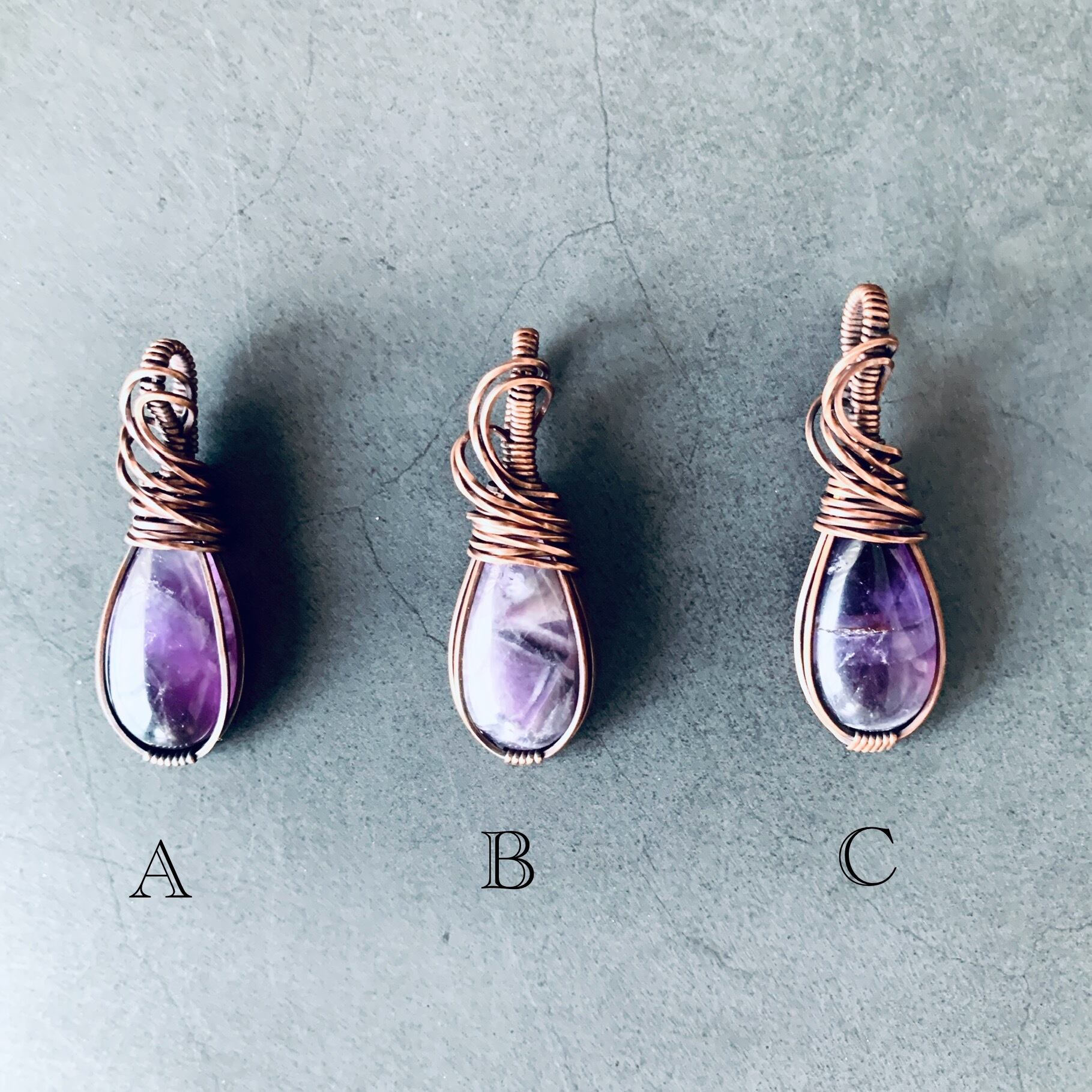 一つ一つに個性がある天然石をワイヤーラッピングしています。ちょっとした力加減で雰囲気が変わる一点物はA,B,Cからお選び頂けます。