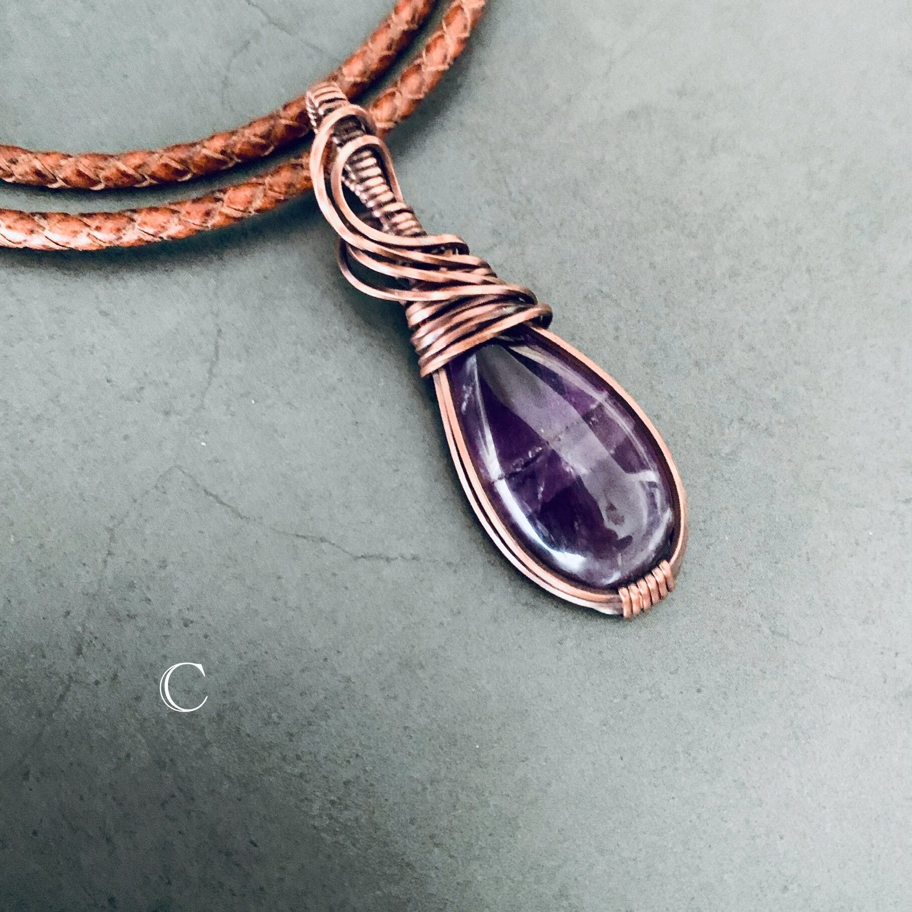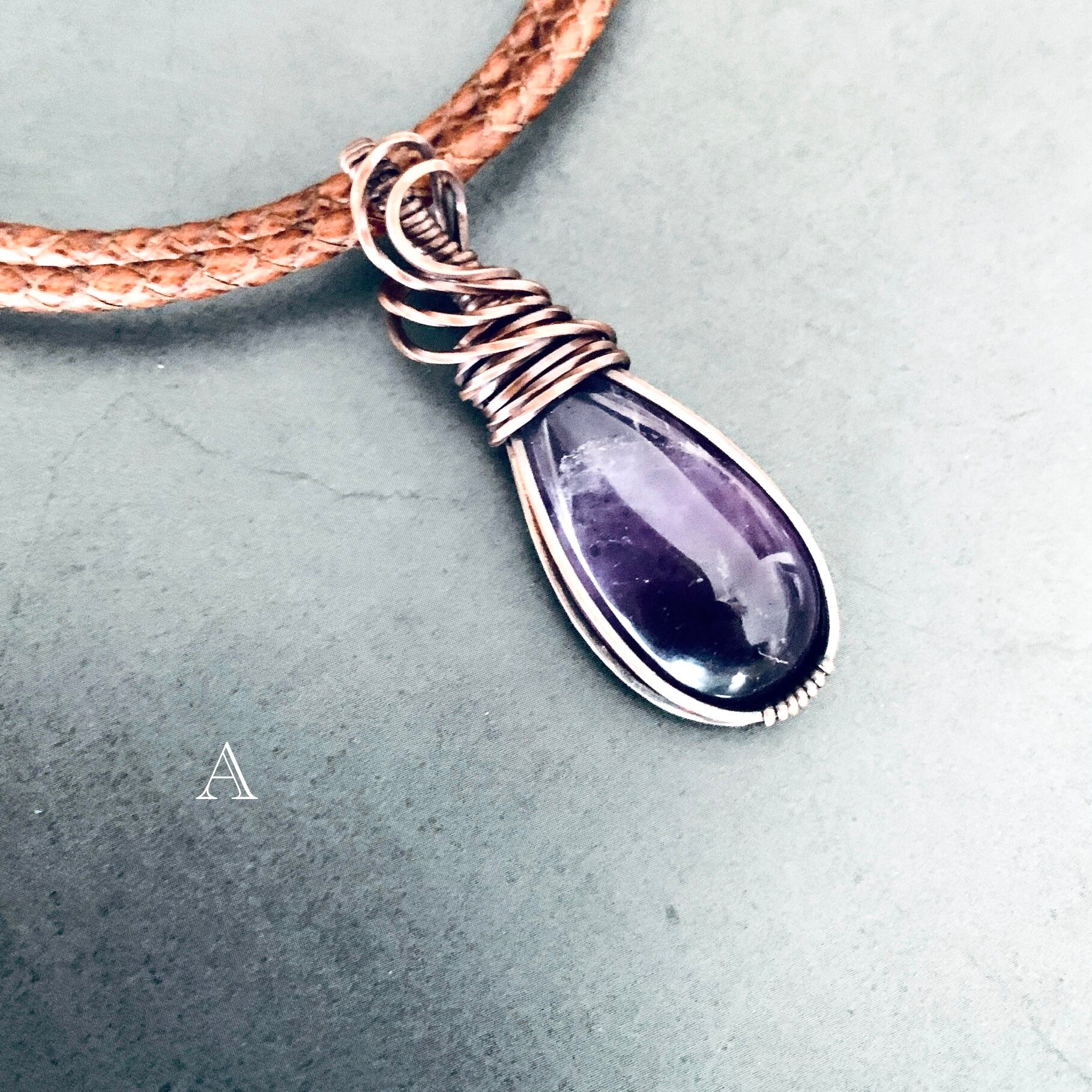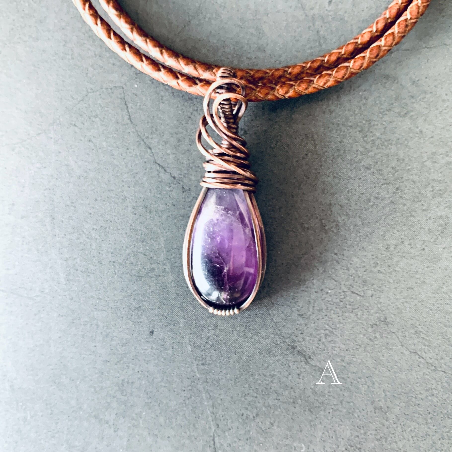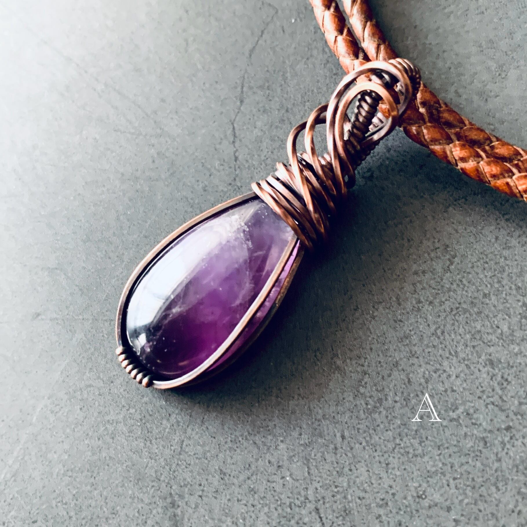 【2月誕生石・一点物】天然石アメジストのワイヤーラッピングした大ぶりペンダント⭐︎ボヘミアン・ギフト:本革紐付き