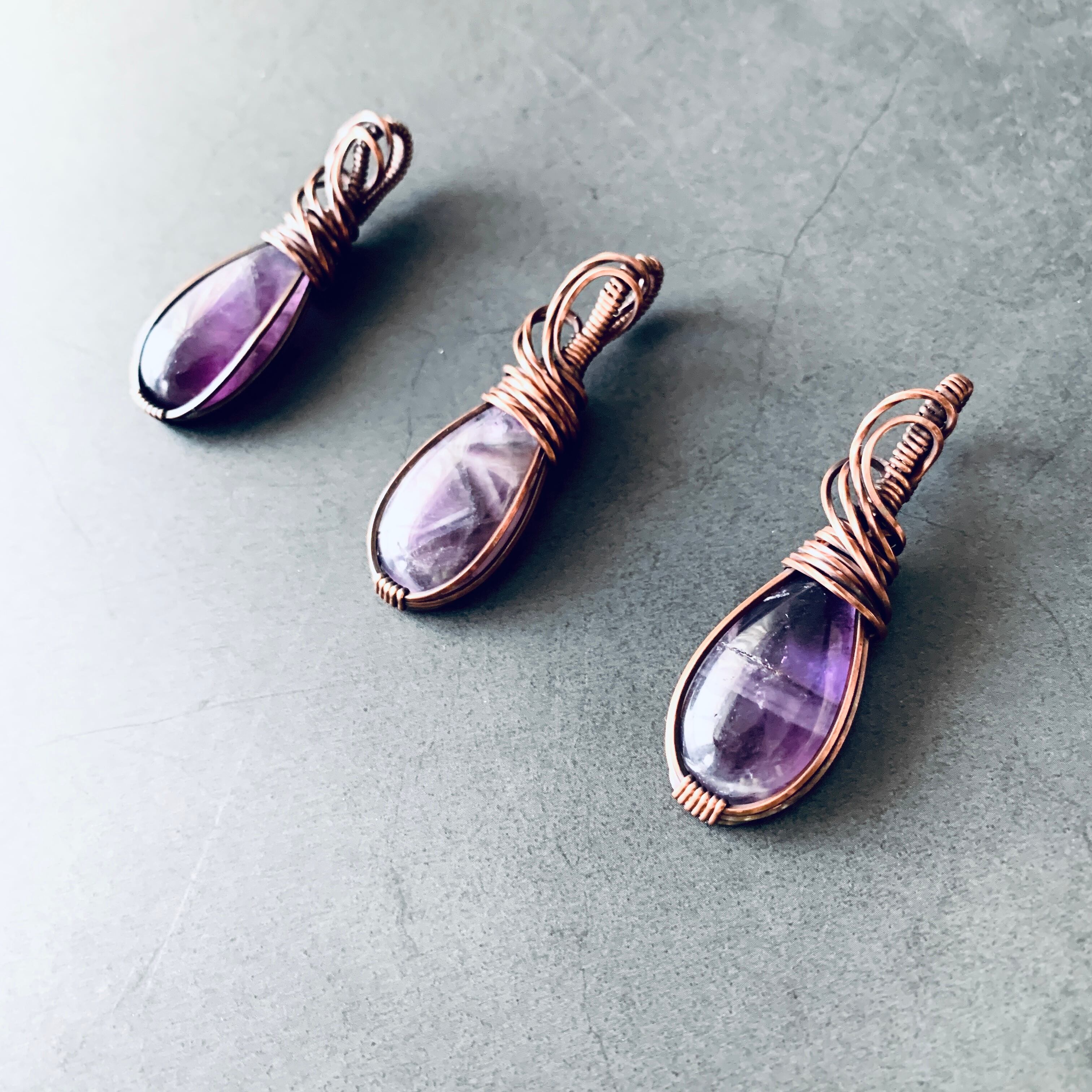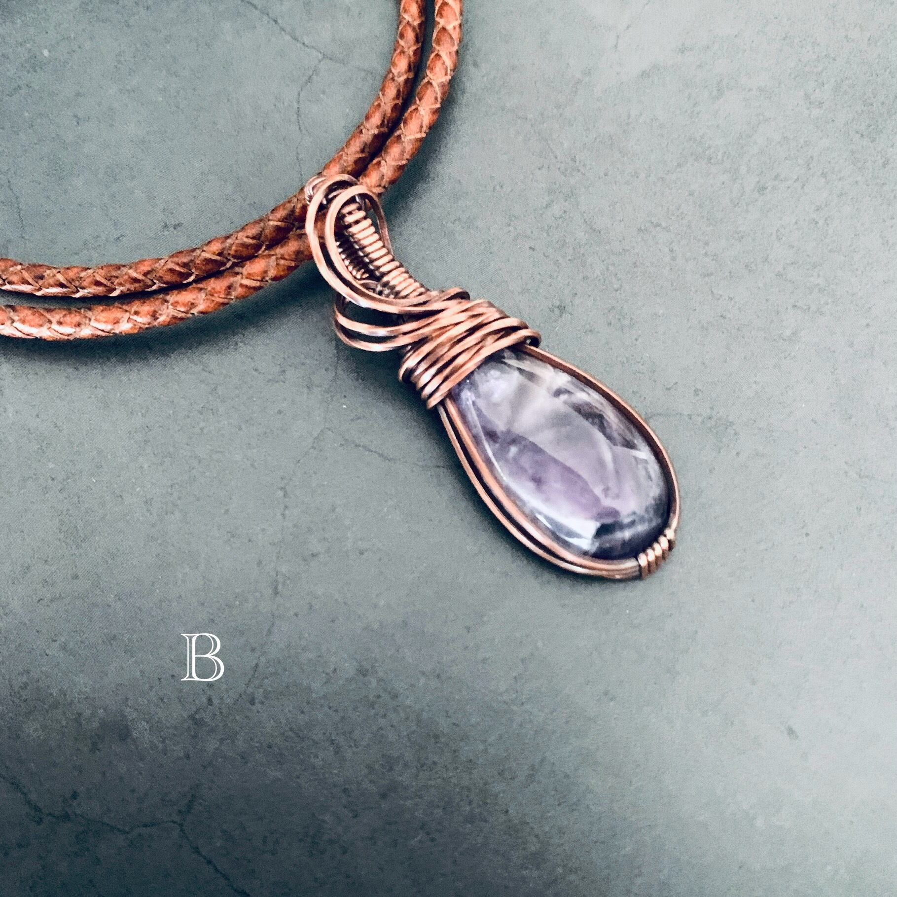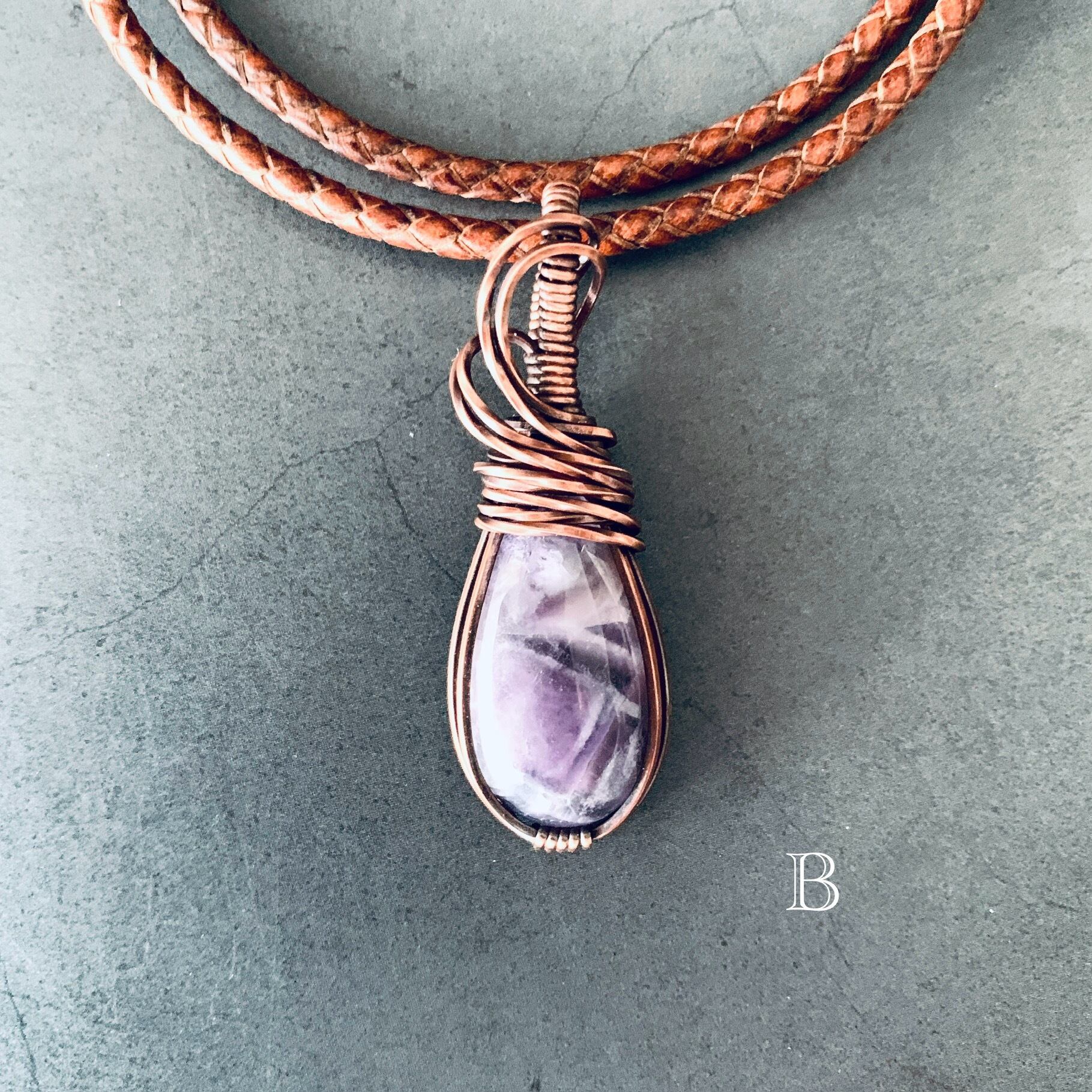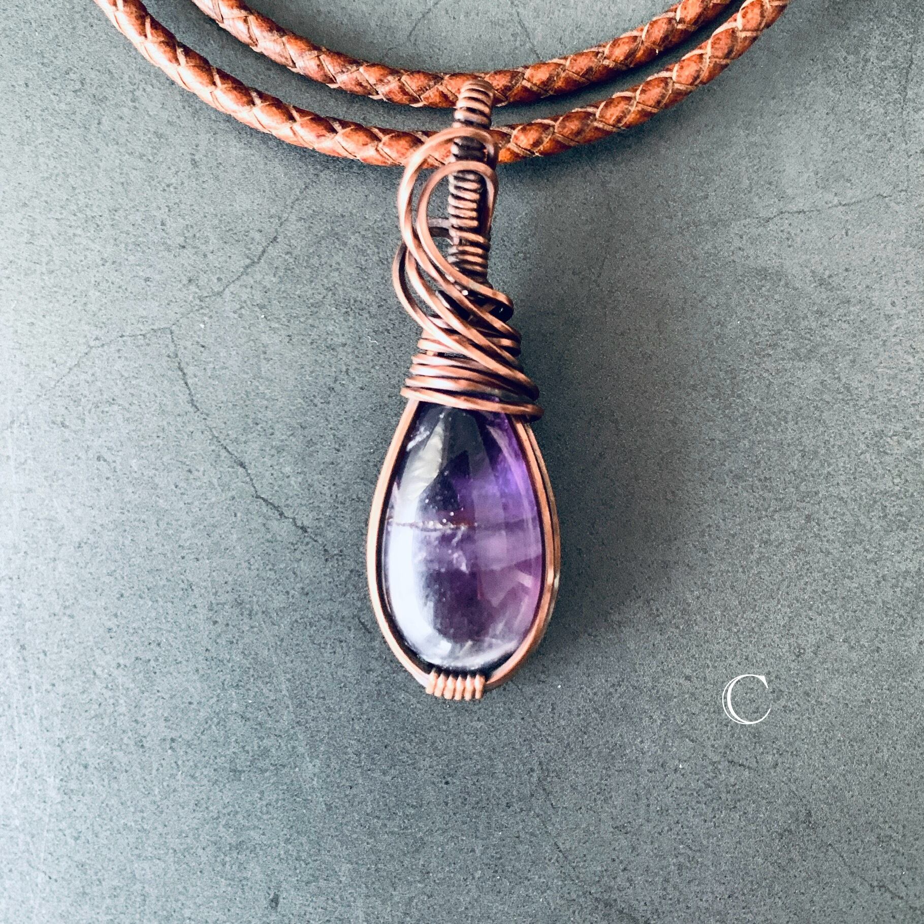【2月誕生石・一点物】天然石アメジストのワイヤーラッピングした大ぶりペンダント⭐︎ボヘミアン・ギフト:本革紐付き